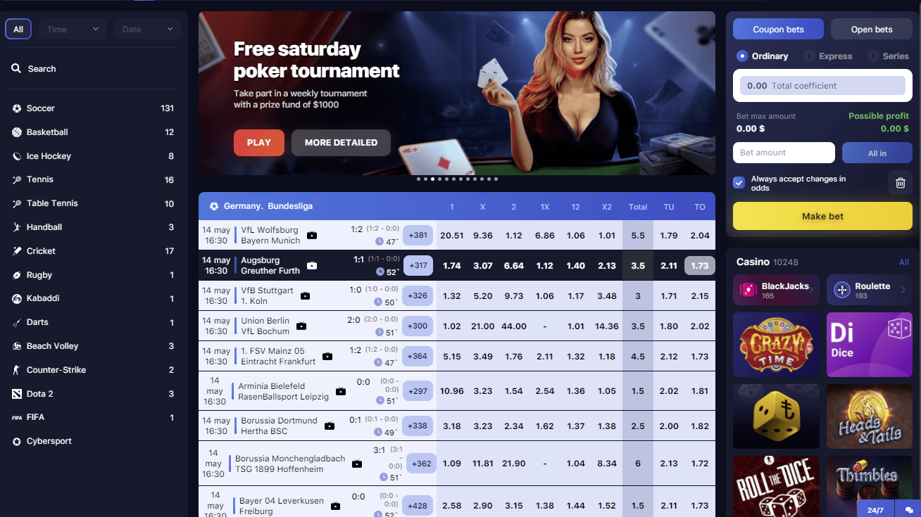 The casino section offers over 3,200 slot games and table games from trusted providers. If you have a valid license, the list can be expanded further, giving players even more choices.